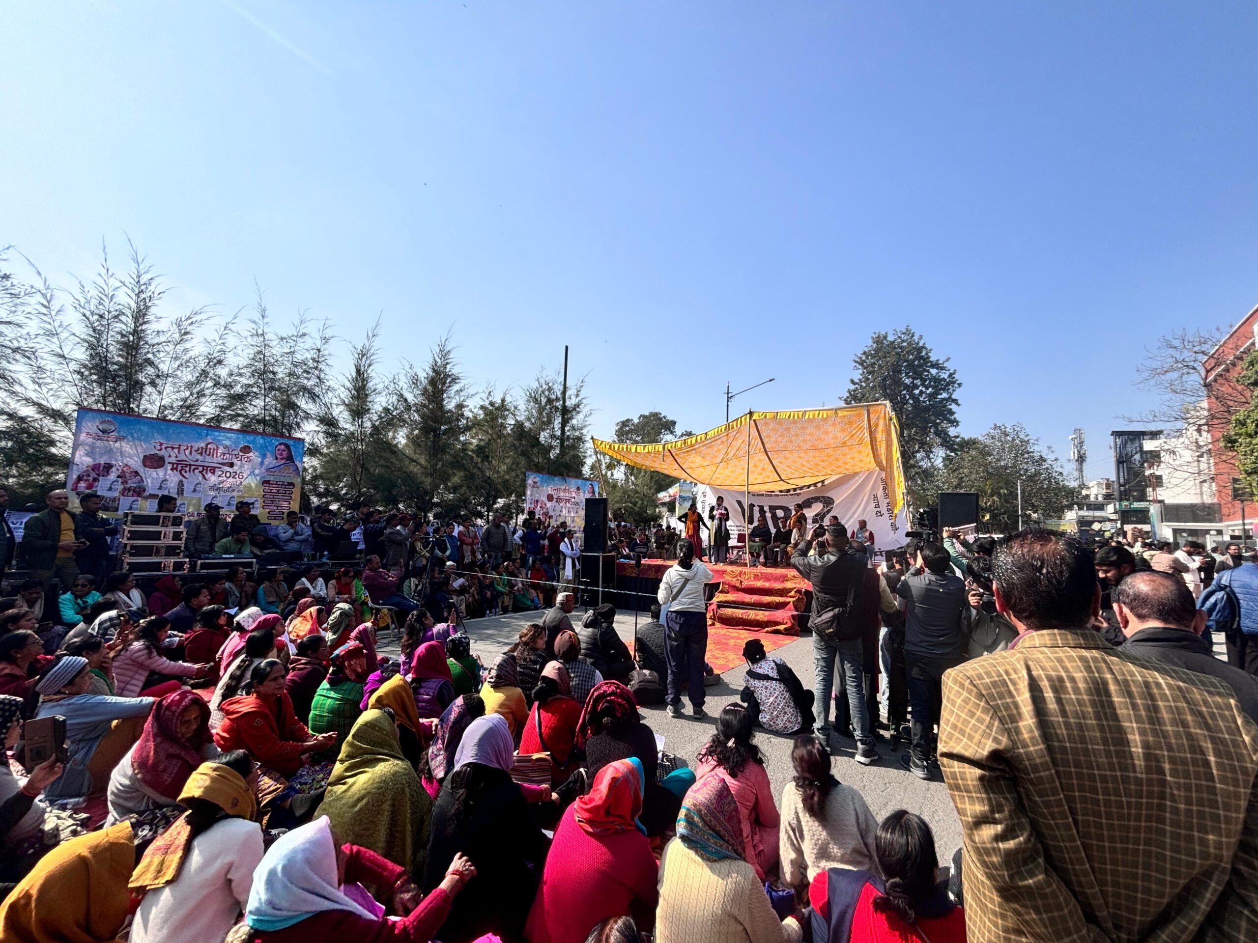 Hundreds of people from a large number of social political and cultural organisations converged in front of the historic parade for the ‘Mahapanchayat’ despite efforts being made by the state administration to deny space for such a gathering. Although the announcement to hold a ‘Mahapanchayat’ was held last month, the state administration instead allowed holding of a four day ‘Uttarayani’ festival under the tutelage of Geeta Dhami, wife of Uttarakhand Chief Minister Pushkar Singh Dhami at the venue. Despite pressure from the police and administration to change the venue, the ‘Ankita Nyaya Yatra Sanyukt Sangharash Samiti’, did not budge and remain adamant on holding the ‘Mahapanchayat’ at the same place. However, since the parade ground was already occupied, the ‘Mahapanchayat’ was held outside the ground.
